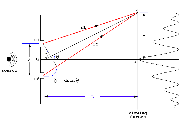 Since destructive interference occurs when waves arrive at the screen 180° out of hpase, dark fringes can be found when their path lengths differ by an odd integer multiple of a half wavelength: