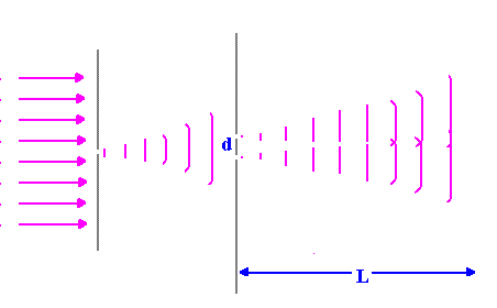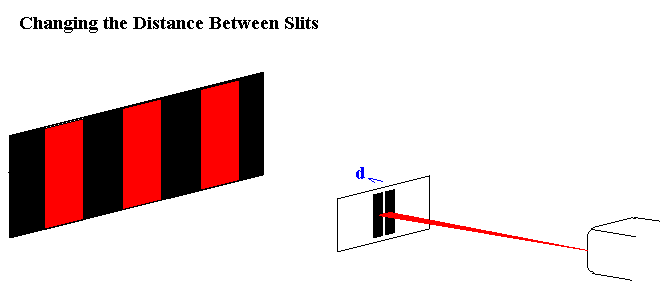Increasing the length of d decreases the spacing between different fringes. This is consistent with the fact that spacings between different fringes inversely depend on d. This second diagram shows what happens to waves as they pass through the slits as d varies. More interference occurs when d is wider. |