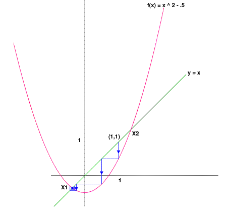 So lets solve f(x) = x ie x^2 - .5 = x therefore x^2 -x -.5 = 0