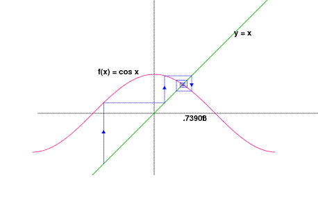 Experimentally, The animation above showed that fn(x) --> 0.73908 as n -> oo .