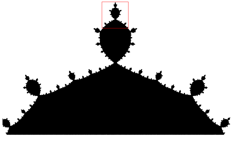 ,It seems that the magnified region looks exactly the same as the set. This phenomena is called fractional dimention or fractals.