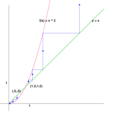 For Example, the orbit of 2 under squaring function is : 2,4,16,256,65536,...and below you see the graphical interpretation of two orbits.