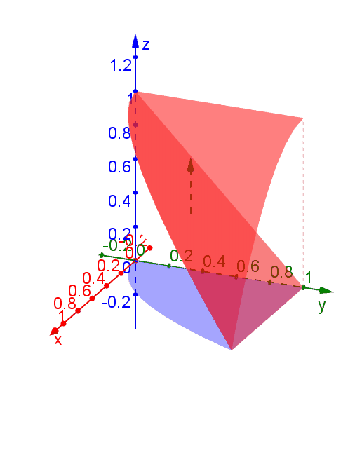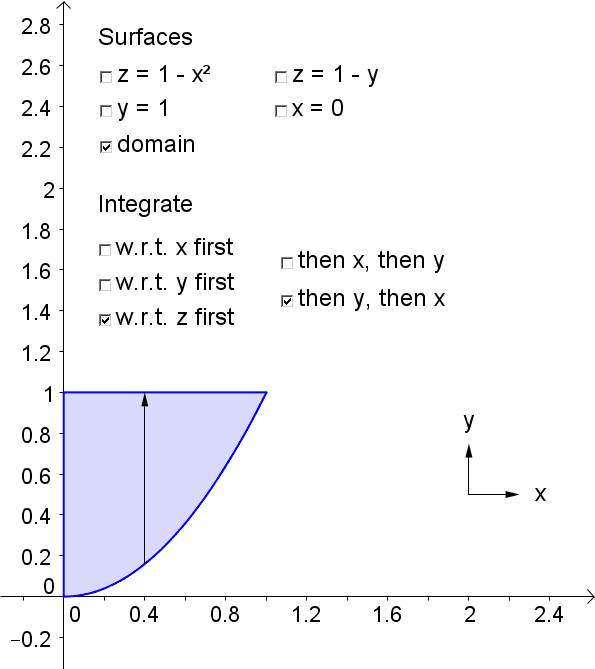 We consider the triple integral \[\iiint_E f(x,y,z) \,dV\] where \(E\) is the solid bounded by \(z = 1-x^2\), \(z = 1-y\), \(y = 1\) and \(x = 0\). There are six ways to write this triple integral as an interated integral in Cartesian coordinates: \[\int_0^1 \int_{1-z}^1 \int_0^{\sqrt{1-z}} f(x,y,z) \,dx \,dy \,dz\] \[\int_0^1 \int_{1-y}^1 \int_0^{\sqrt{1-z}} f(x,y,z) \,dx \,dz \,dy\] \[\int_0^1 \int_0^{\sqrt{1-z}} \int_{1-z}^1 f(x,y,z) \,dy \,dx \,dz\] \[\int_0^1 \int_0^{1-x^2} \int_{1-z}^1 f(x,y,z) \,dy \,dz \,dx\] \[\int_0^1 \int_0^{\sqrt{y}} \int_{1-y}^{1-x^2} f(x,y,z) \,dz \,dx \,dy\] \[\int_0^1 \int_{x^2}^1 \int_{1-y}^{1-x^2} f(x,y,z) \,dz \,dy \,dx\]